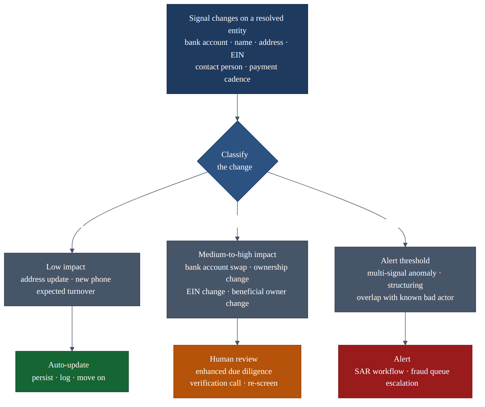 A change-detection pipeline. Delta monitoring sitting on top of the graph. When an attribute moves, classify the change, score the impact, route the response. Same confidence-gating pattern as the initial match. Same independent-evaluator requirement.