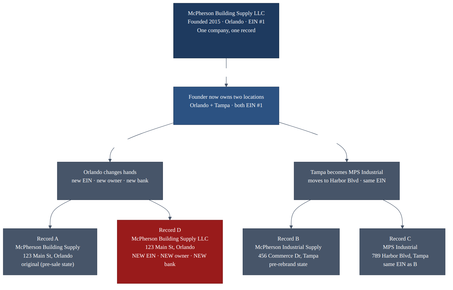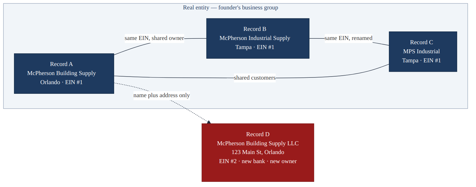 - Record A (McPherson Building Supply LLC, Orlando, original) and Record B (McPherson Industrial Supply, Tampa) share an EIN and a beneficial owner — the founder.
