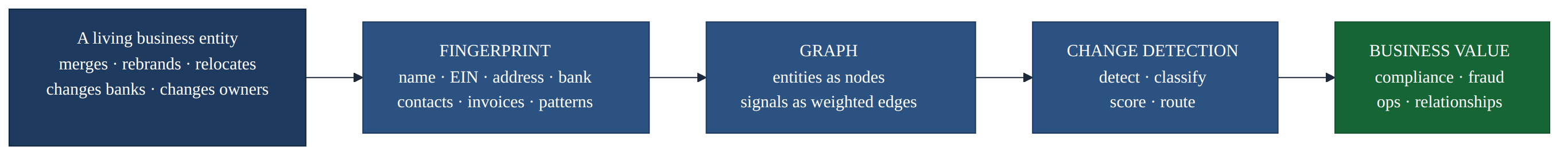 The companies getting this right — whether they sit in payments, fraud, compliance, lending, insurance, or supply chain — are not the ones with the best string-matching algorithm. They are the ones that built the whole stack. The fingerprint. The graph. The change detection. The verification layer around the model that catches the errors the model does not know it is making.